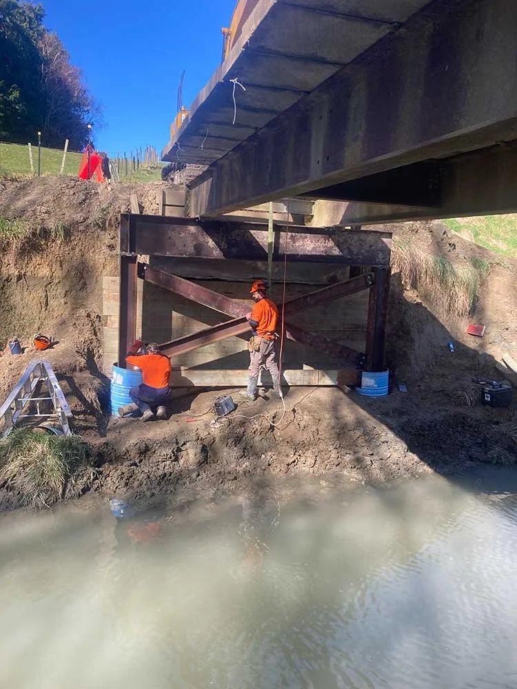 In Elsthorpe, Hawke’s Bay, Rycroft Construction was engaged to strengthen an existing bridge to meet updated engineering and load requirements. The project involved installing a new steel pile bent system beneath the bridge to provide additional support and stability to the existing structure.